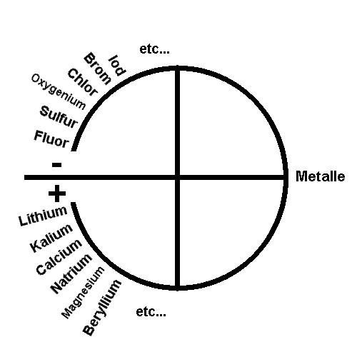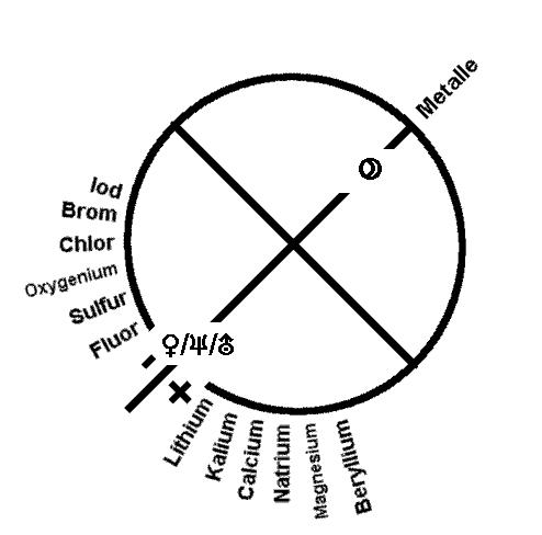 Dr. med. Ferdinand Maack hat in einer Schrift namens Polarchemiatrie - ein Beitrag zur Einigung alter und neuer Heilkunde, Leipzig, Verlag Altmann, 1905, eine elektrochemische Reihe angegeben, mit der u.a. früher die chemischen Elemente des Periodensystems geordnet wurden. Bei dieser elektrochemischen Reihe wird anhand der Elektrolyse festgestellt, ob ein bestimmtes Element negativ oder positiv beschaffen ist. Man kann z.B. einen elektrischen Strom durch eine Lösung fließen lassen, so daß die beiden Bestandteile der Lösung, z.B. bei Wasser (H2O) der Wasserstoff mit seinen H-Ionen und der Sauerstoff mit seinen O-Ionen, sich an den in die Lösung gehaltenen Elektroden sammeln. Der positive Bestandteil des Wassers, d. h. der Wasserstoff, sammelt sich an der negativ geladenen Elektrode, der sogenannten Kathode, während der negativ geladene Bestandteil, der Sauerstoff, sich an der positiv geladenen Elektrode, der Anode ansammelt. Durch diese so genannte Elektrolyse können chemische Verbindungen in zwei polare Bestandteile getrennt werden - in das sogenannte negative Anion-Element und das positive Kathion-Element. Anion und Kathion entsprechen zugleich den verschiedenen Gruppen im Periodensystem der Elemente. Die positiven Kathionen-Elemente befinden sich hauptsächlich bei den Alkali- und Erdalkalimetallen auf der linken Seite des Periodensystems, während sich die negativen Anionen-Elemente eher bei den Halogenen und Chalkogenen auf der rechten Seite des Periodensystems befinden. Zu den positiven Kathionen-Elementen gehören Lithium, Kalium, Calcium, Natrium, Magnesium, Strontium usw. Zu den negativen Anionen-Elementen gehören z.B. Fluor, Schwefel, Sauerstoff, Chlor, Brom, Iod, etc. Diese Elemente lassen sich in eine Reihung bringen, die von positiv zu negativ reicht und die also ungefähr der Reihenfolge der Hauptgruppen entspricht, in denen diese Elemente stehen. Man spricht hier auch von der elektrochemischen Spannungsreihe. Maack wiederum nun verbleibt nicht bei der puren Aufreihung der Elemente, sondern ordnet diese in einen Kreis, den sogenannten polarchemiatrischen Kreis: